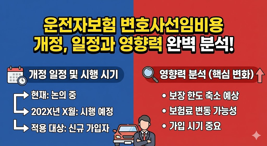 운전자보험 변호사선임비용 개정 일정과 영향력 분석을 정리했습니다. 변호사선임비용 담보는 운전자보험의 핵심 보장이며, 이번 개정으로 가장 큰 변화와 충격이 예상되는 부분입니다. 이 글에서는 개정 일정, 적용 범위, 실제 영향력까지 모두 분석했습니다.